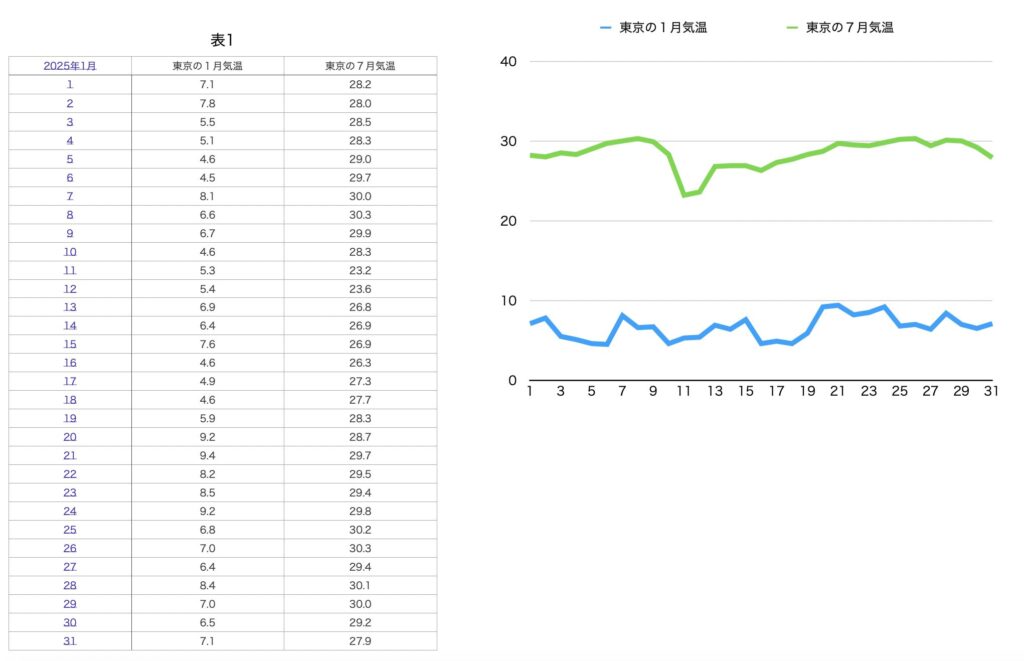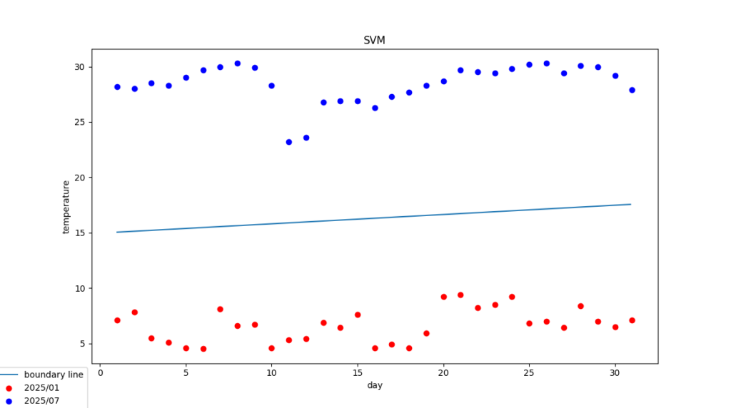 そこで選んだデータは、東京都の冬(2025年1月)と夏(2025年7月)の平均気温を使用することにしました。図を見てもわかるように、はっきりと境界が引けそうです。